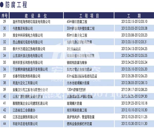 宏順建設工程有限公司是國家批準成立的專業高空作業企業:承攬過(國內.國外)煙囪新建、煙囪防腐、磚煙囪新建、煙囪改造、煙囪維修、煙囪脫硫防腐、煙囪拆除加高、煙囪滑膜等高空作業工程。具有“不搭腳手架 、 不需要停產”施工特點。